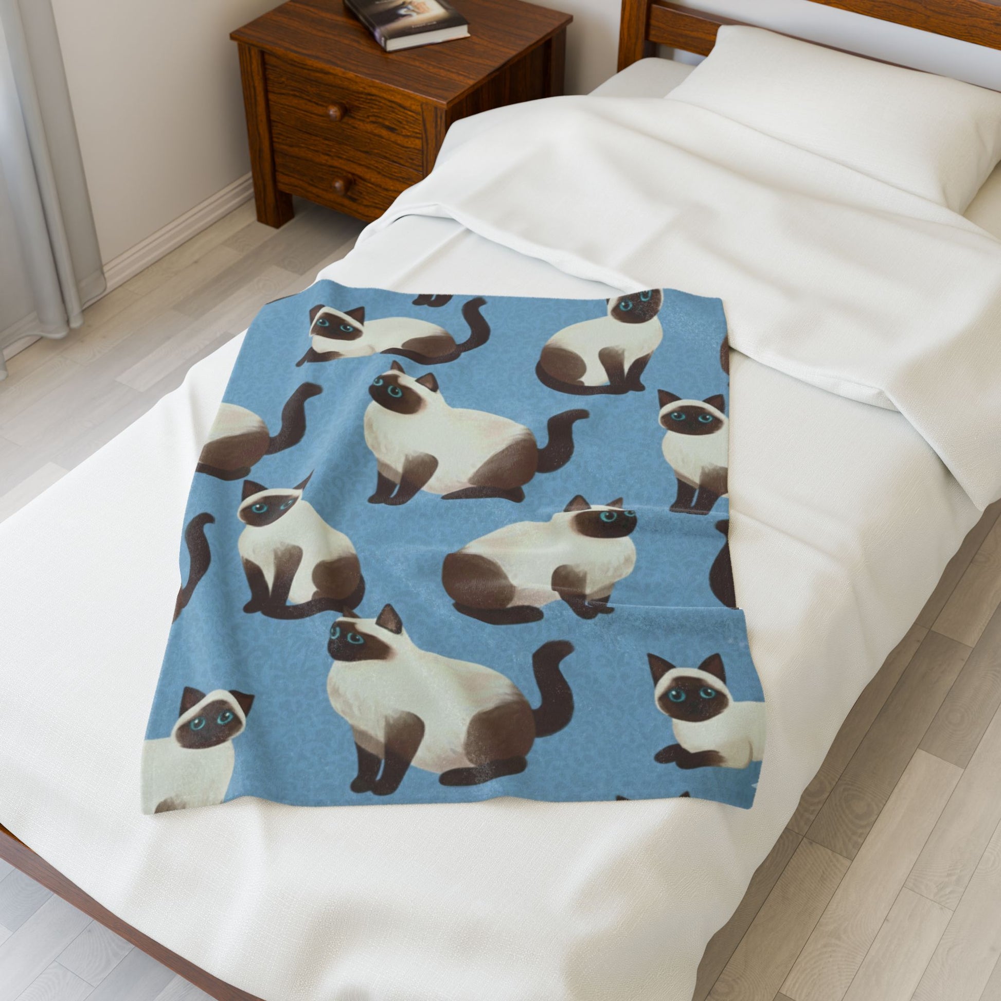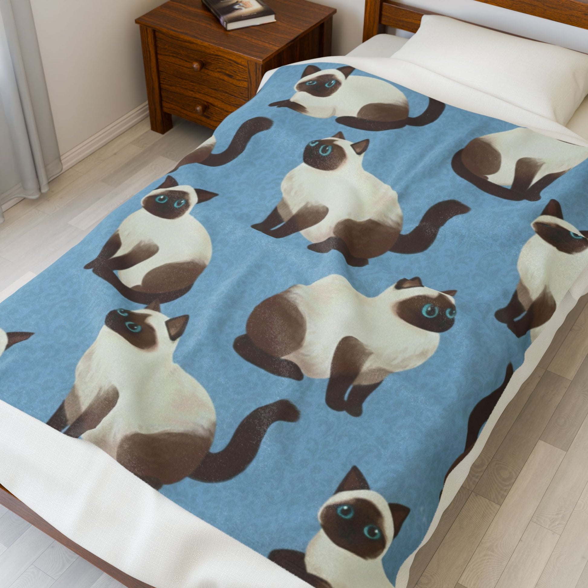 Wrap yourself in quiet comfort with this velveteen plush blanket, printed on one side with a charming Siamese cat pattern against a soft blue ground. The surface feels silky and plush under your hands, while the medium heavy-weight fabric gives gentle warmth without feeling bulky. Drape it over the couch during slow evenings, fold it at the foot of a bed for a cozy pop of personality, or keep it within reach for reading nooks and chilly mornings. The illustrated cats bring a calm, playful presence — a little companion that brightens routine moments and settles the room with friendly, low-key style.
