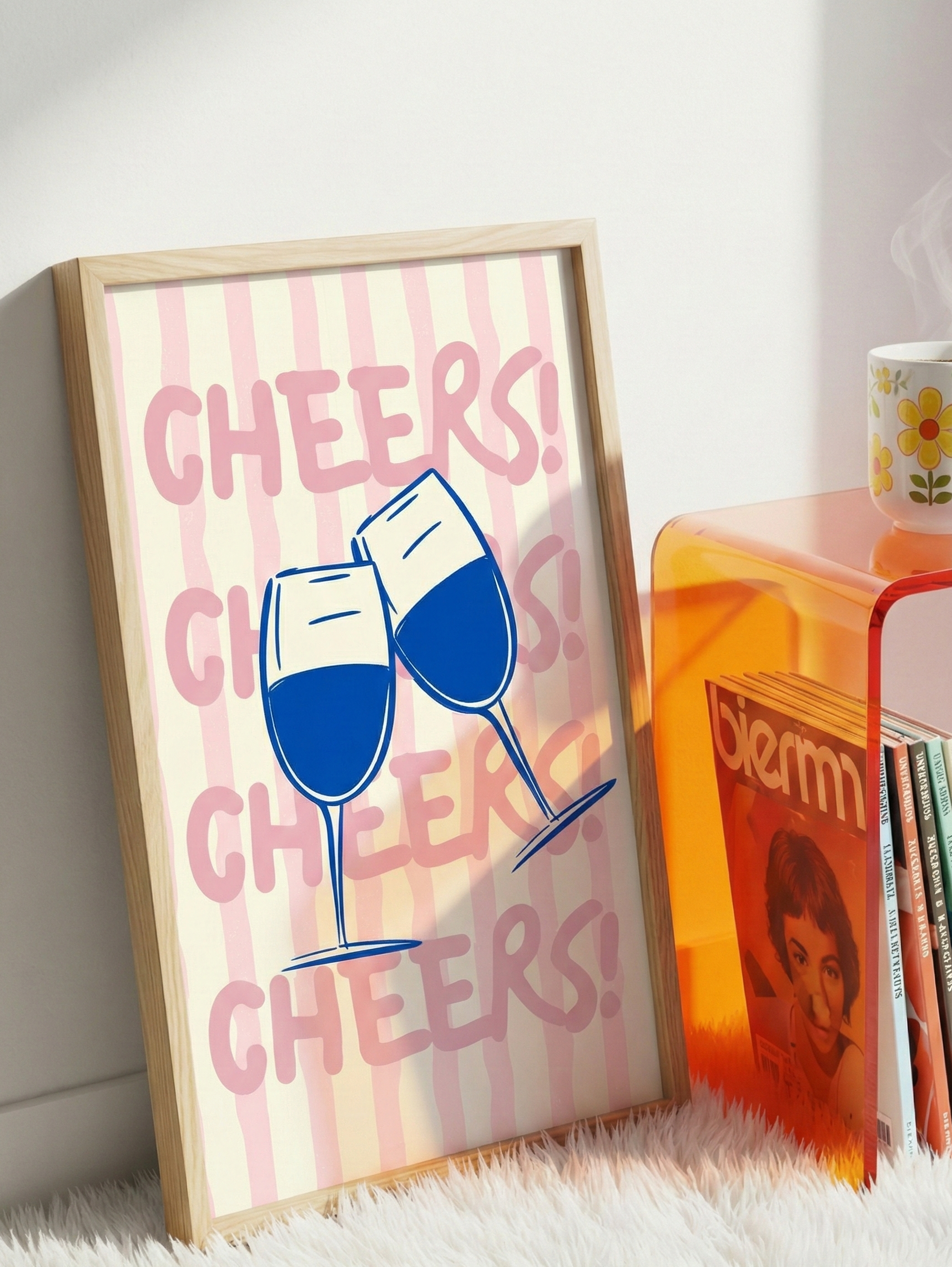 Bring a bubbly, celebratory mood to any indoor space with this matte vertical poster. Two clinking wine glasses sit front and center against soft pink vertical stripes and playful hand-lettered “CHEERS!” repeats. The design reads like a cheerful toast — bright, casual, and just a little whimsical — adding a friendly, lighthearted accent to kitchens, dining nooks, home bars, or party walls. Printed using giclée methods on museum-grade archival paper, the colors stay vivid while the matte finish keeps glare low and the artwork feeling warm and tactile. Choose from many sizes to fit your wall and hang it as a focal piece for gatherings or as a daily reminder to celebrate small moments.